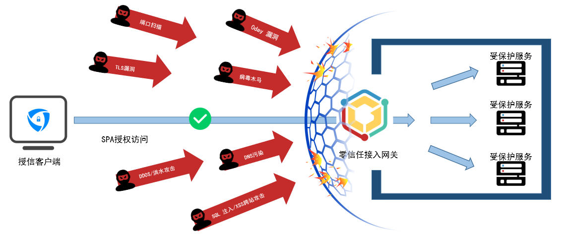 受保護的服務對未授權用戶及設備完全不可見,無法通過端口掃描發(fā)現(xiàn)服務。 這些服務默認在互聯(lián)網(wǎng)實現(xiàn)“隱藏“。嚴格的終端單包敲門機制, 確保只有認證過的用戶及設備才能訪問受保護服務。