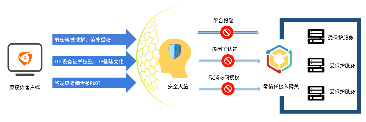 云涌零信任可以保護邊緣計算設備的身份安全與數(shù)據(jù)安全,使每個邊緣網(wǎng)關成為獨立的安全區(qū)段, 網(wǎng)關內(nèi)業(yè)務服務受零信任平臺保護。