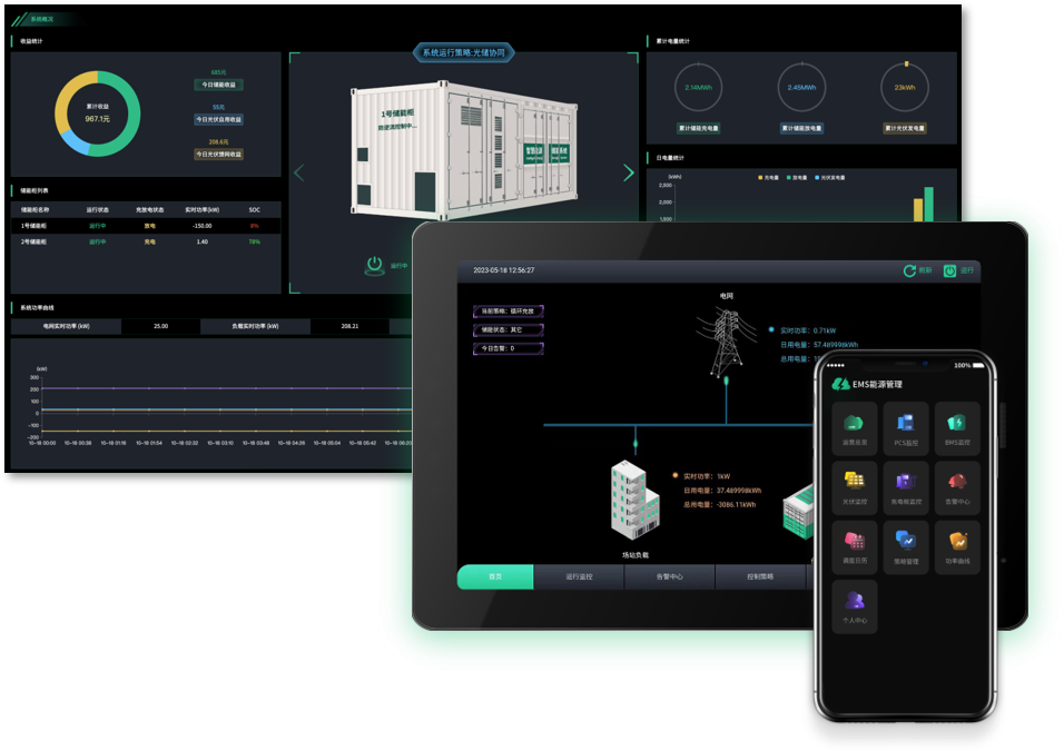 EMS系統(tǒng)從整個場站的視角展示源網(wǎng)荷儲能量流轉(zhuǎn)的實時情況,并聚合統(tǒng)計電網(wǎng)、負載、儲能、光伏以及充電樁等節(jié)點的實時功率和電量數(shù)據(jù)。該系統(tǒng)還支持顯示當(dāng)前場站的運行策略、儲能電池的狀態(tài)以及系統(tǒng)的一次接線圖等信息。
