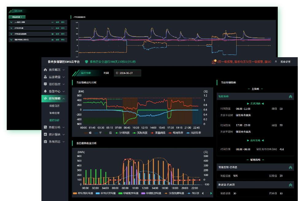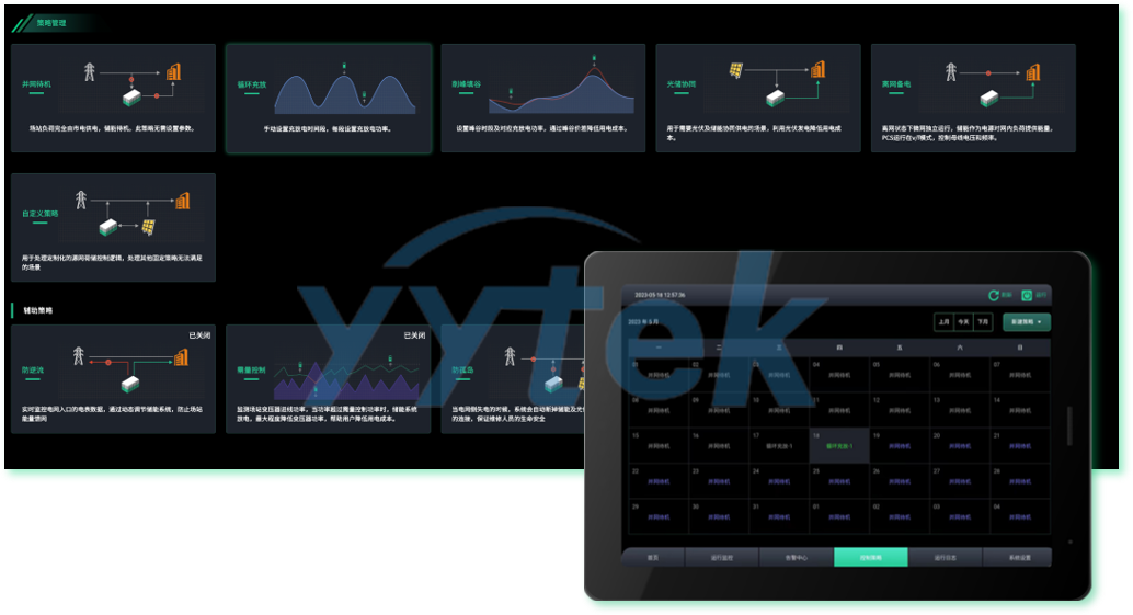 EMS系統(tǒng)支持全面的場站能源控制策略,包括并網(wǎng)待機、循環(huán)充放、削峰填谷、光儲協(xié)同、離網(wǎng)備電、自定義策略、防逆流、防孤島運行、以及需量控制等。場站可以根據(jù)自身需求、當(dāng)?shù)仉妰r策略以及實際生產(chǎn)用電情況,按天設(shè)置相應(yīng)的控制策略。同時,系統(tǒng)支持連接云涌VPP運營管理系統(tǒng),接收虛擬電廠平臺下發(fā)的需求響應(yīng)策略并執(zhí)行。