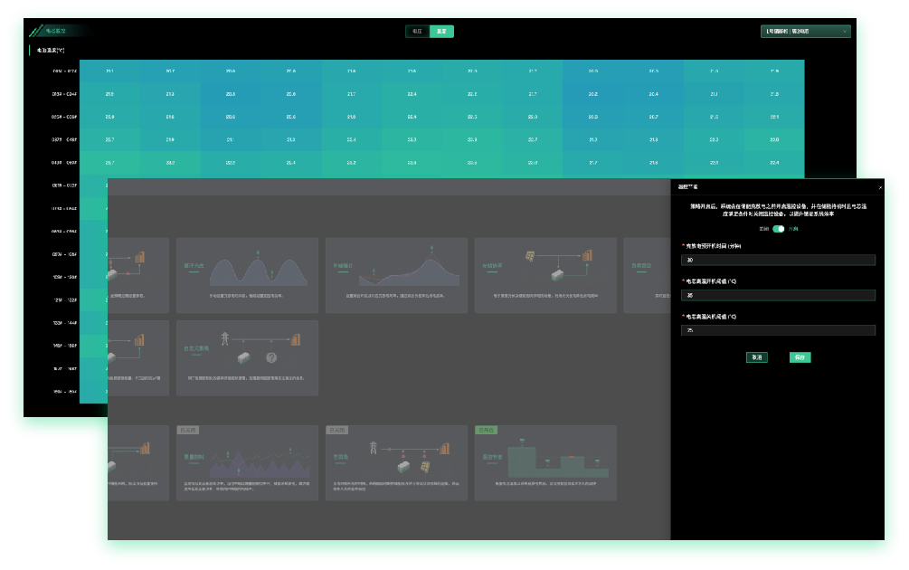 系統(tǒng)內(nèi)置多種針對空調(diào)或冷水機的節(jié)能聯(lián)動策略。聯(lián)動策略不僅與儲能柜內(nèi)環(huán)境溫度關(guān)聯(lián),同時與儲能系統(tǒng)運行狀態(tài)相聯(lián),在保證電芯溫度安全的前提下盡可能的減少溫控設(shè)備的能耗。