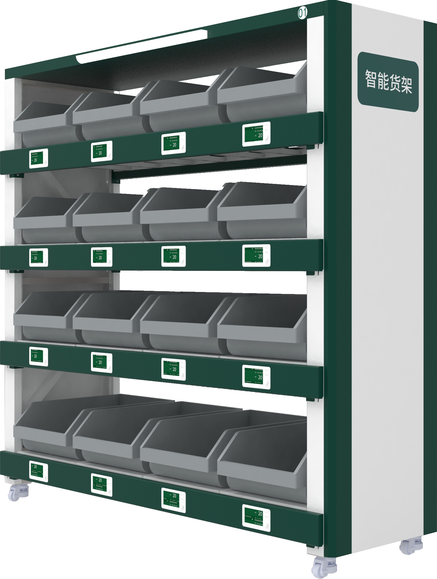 RFID智能貨架:用于管理尺寸較大的工具,通過RFID技術實現(xiàn)物品定位識別,通過指示燈實現(xiàn)存取操作精確引導。