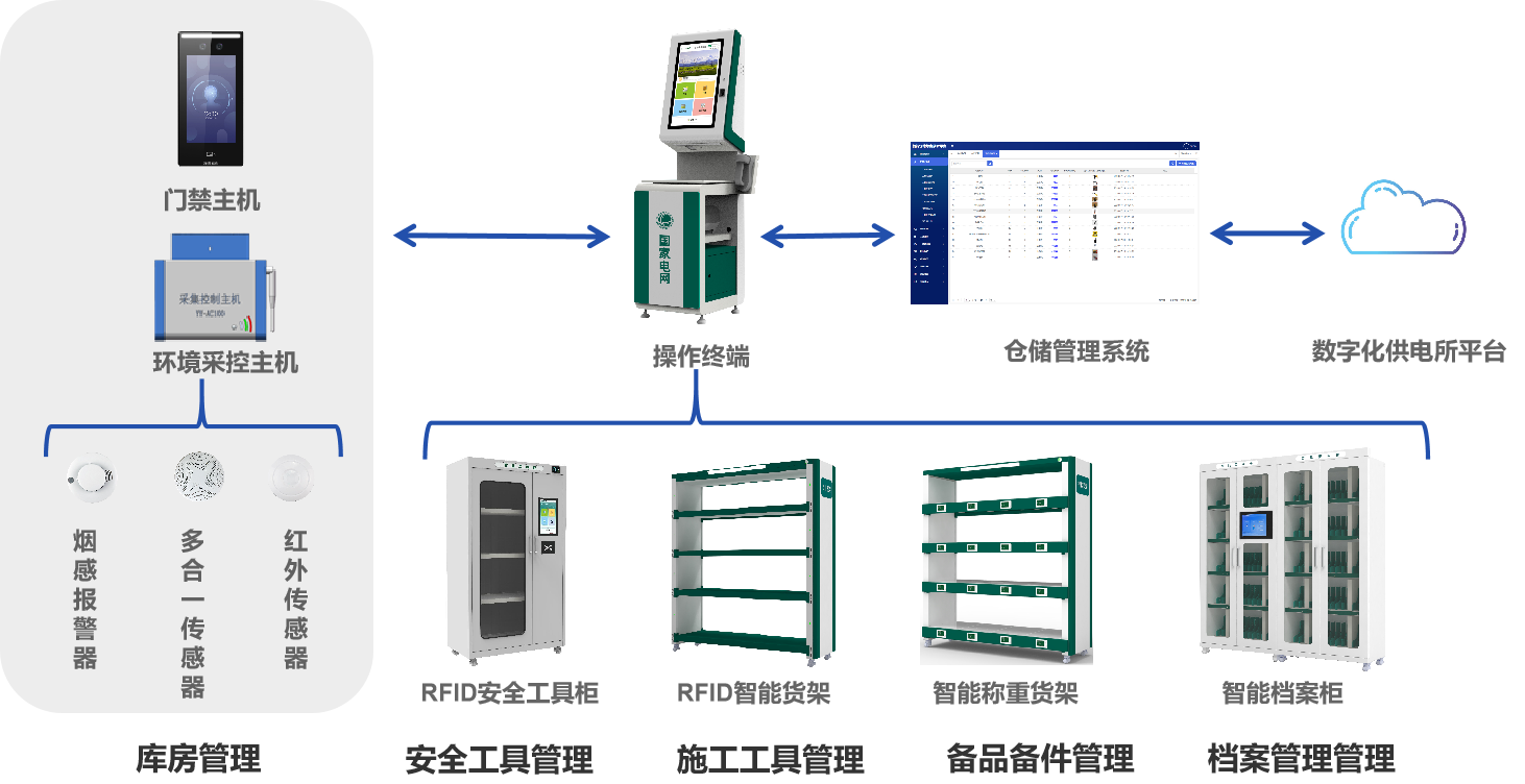 此外為了更好的實現(xiàn)自動控制、智能照明、安全防護以及數(shù)據(jù)分析,針對供電所“四庫“的室內(nèi)存儲環(huán)境管理,我們配有一整套專門的庫房管理系統(tǒng),以及系統(tǒng)配套的輔助設備,比如操作終端、RFID通道門和標簽等,并結(jié)合使用基于物聯(lián)網(wǎng)、云計算等新技術構(gòu)建的智能一體化管控平臺,系統(tǒng)管理員不僅可以實現(xiàn)對多個庫房的站點管理,還能獲得更加智能化、多元化的管理解決方案。